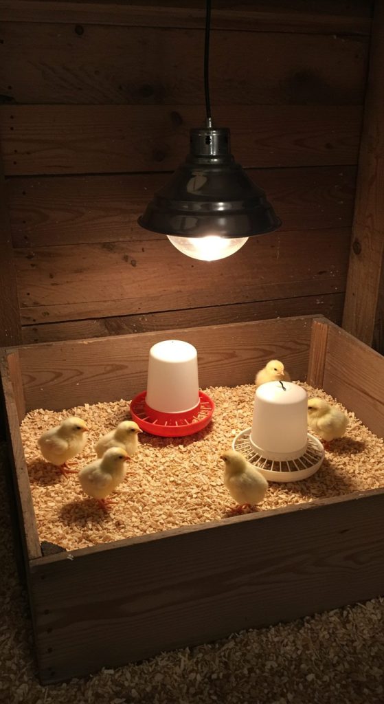 Recycling a sturdy cardboard box is another simple brooder solution. Line it with newspaper and shavings, and clip a heat lamp to a nearby stand.