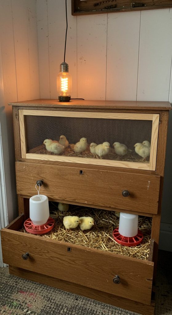 Got an old dresser? Remove a drawer and convert it into a stylish brooder. Line it with bedding and add a screen top.