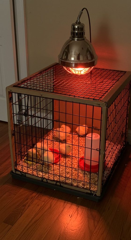Use a heat lamp, ceramic bulb, or brooder plate. Ensure chicks can move closer or further away to self-regulate temperature.