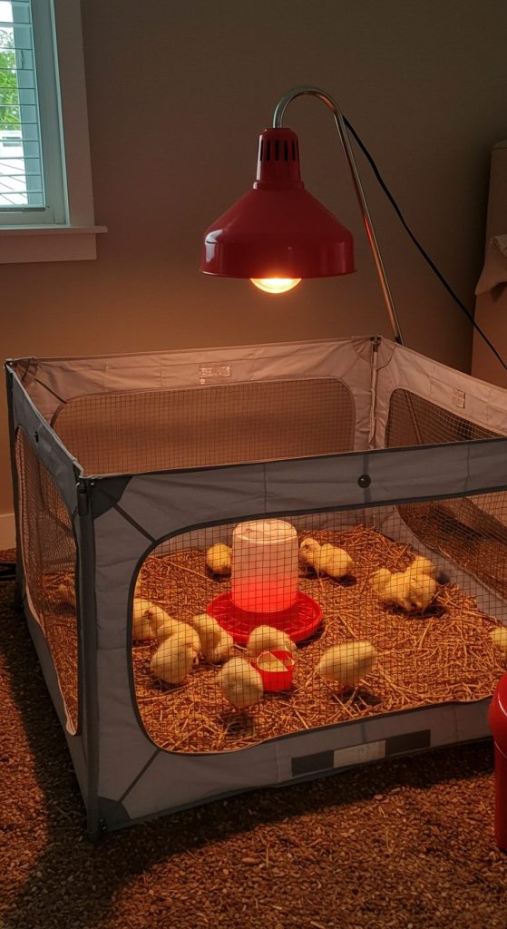 Repurpose a baby playpen into a cozy chick brooder by adding a waterproof lining, bedding, and a screen top. It’s soft-sided and safe.