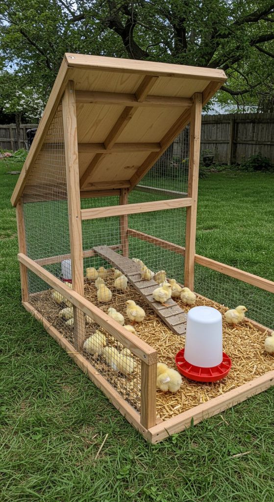 If you live in a warmer climate, building a wooden outdoor brooder with a hinged roof can offer great space and natural light. Use hardware cloth and secure latches.