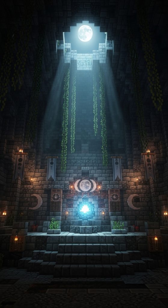 Craft a shrine that feels celestial and sacred. Use dark stone bricks for structure, end rods or glowstone for gentle lighting, and moon-themed decor like quartz crescents or banners. Hanging chains or vines can add depth and texture, making it feel like a hidden sanctuary beneath the earth.