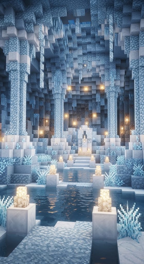 Even underground, you can craft a shrine inspired by frost and ice. Use packed ice, blue glass, and white quartz to create a cold, crystal-like environment. Place ice pillars and snow accents to make the shrine feel otherworldly and elegant.