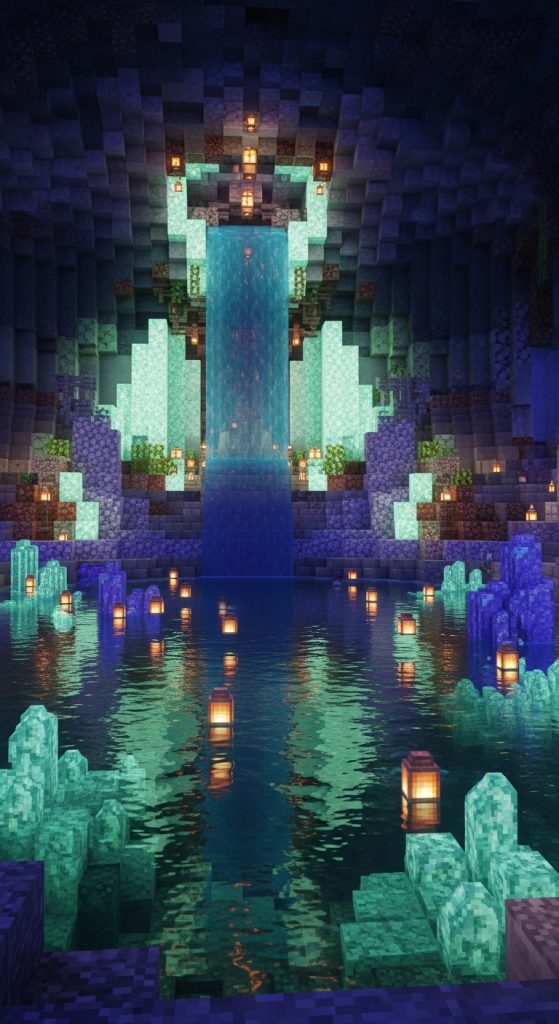 Combine flowing water and sparkling crystal blocks to create a shrine with movement and light. Build an underground waterfall cascading over gemstones or prismarine blocks, pooling into a crystal-clear basin. Soft lighting and reflective surfaces make this shrine peaceful yet awe-inspiring.