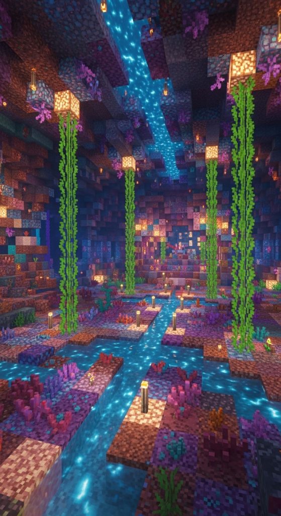 Bring the ocean underground with a vibrant coral-inspired shrine. Use coral blocks, sea pickles, and glowing kelp to illuminate the area. Water channels and small pools can flow through the shrine, giving a soft aquatic ambiance even deep underground.