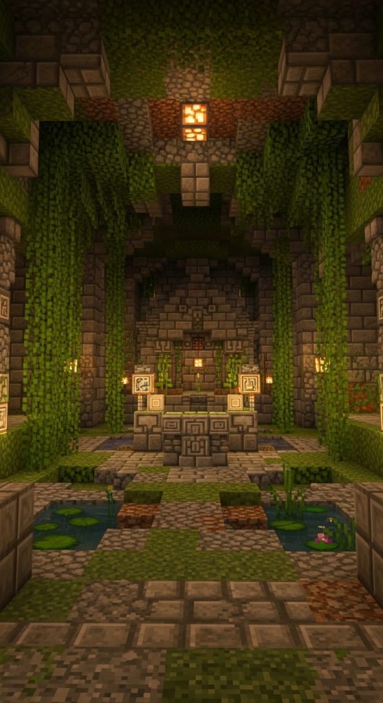 Create an ancient underground temple that tells a story of lost civilizations. Use mossy cobblestone, cracked stone bricks, and vines to evoke age and mystery. Place statues, relics, and bookshelves to hint at the shrine’s historical and magical significance.