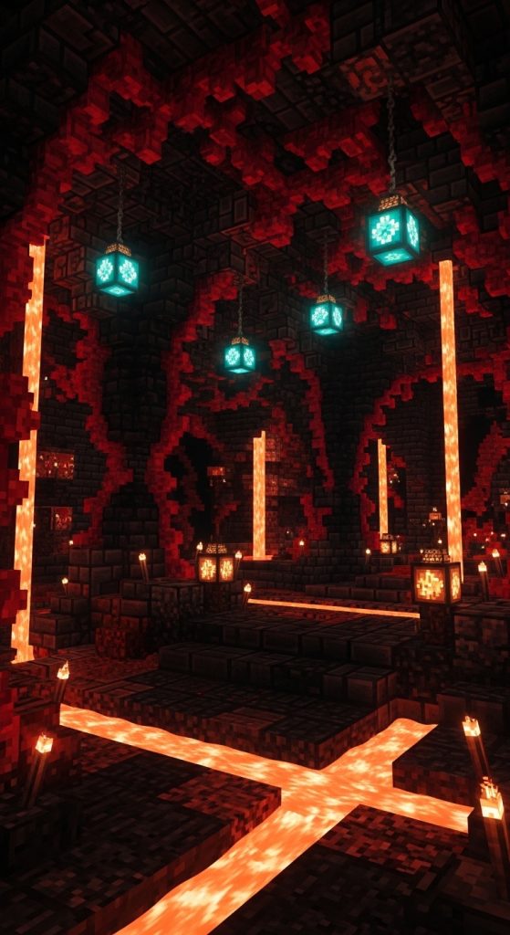 Inspired by the Nether, this shrine can be fiery, dark, and intense. Build with netherrack, blackstone, and crimson stems to create a shrine that feels dangerous yet sacred. Incorporate lava flows, hanging chains, and ancient-looking symbols carved into walls.