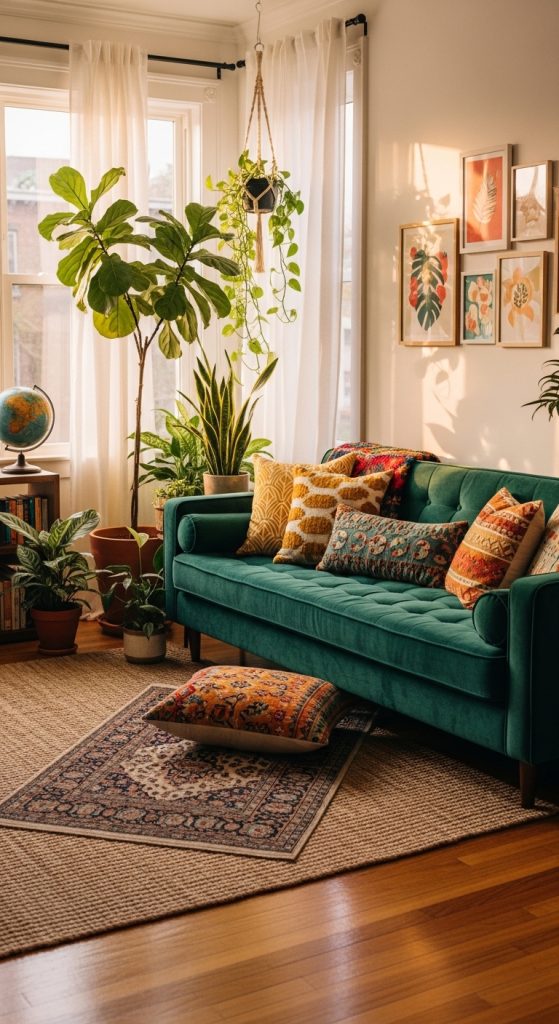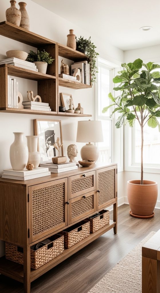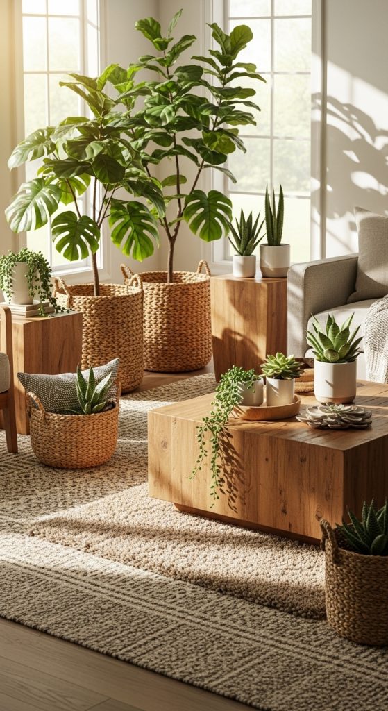 Plants bring life, color, and freshness to any living room. Large leafy plants, hanging planters, or small succulents create a connection with nature. Complement greenery with natural materials like wooden coffee tables, rattan baskets, and stone accents.