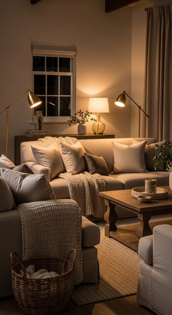 Lighting transforms mood. Combine overhead chandeliers with table lamps, floor lamps, and even wall sconces to create multiple layers of light. Soft, warm lighting adds coziness and invites relaxation, while statement chandeliers bring drama and elegance.