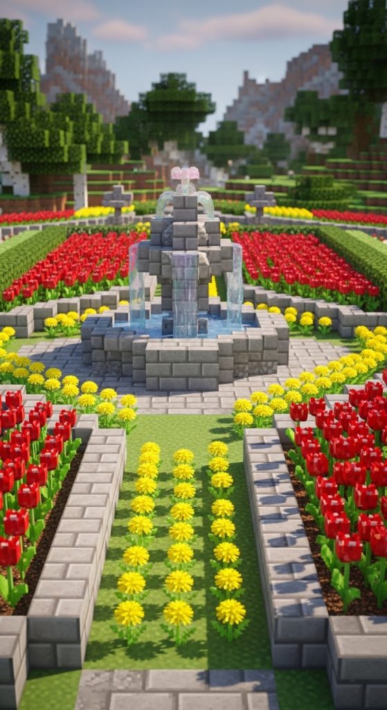 Symmetry adds elegance and a sense of order to any garden. In Minecraft, a classic symmetrical flower bed can be built using alternating rows of flowers, bordered with stone bricks or wooden planks. Centerpieces, such as a small fountain or lantern, enhance the sophistication. Symmetrical designs work wonderfully for front gardens or palace grounds, providing a timeless aesthetic.