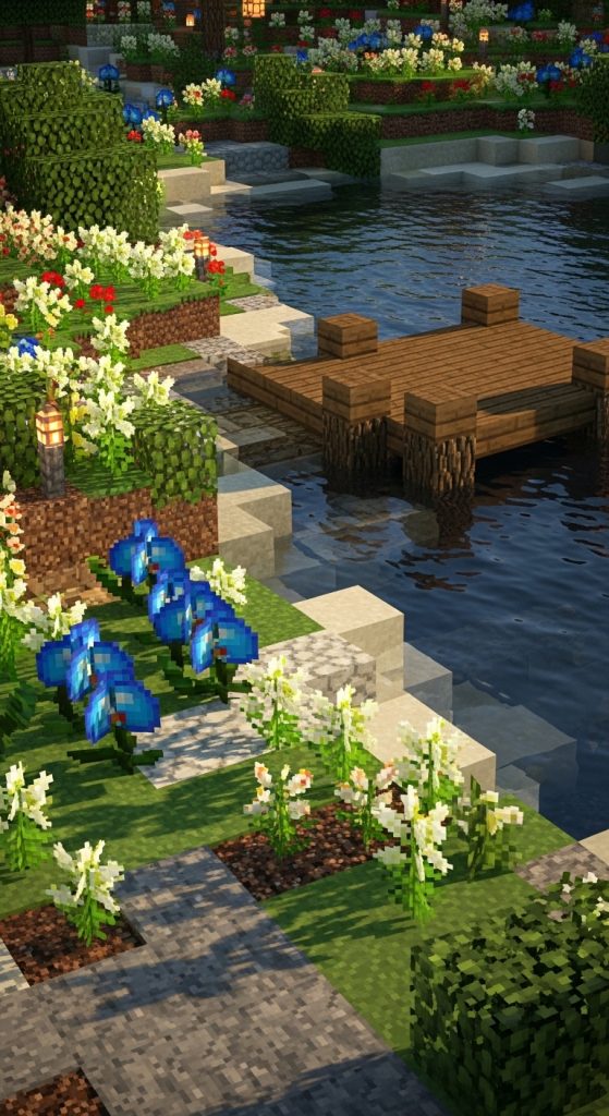 Enhance your riverside or pond area with lush flower beds along the water’s edge. Combine lilies, blue orchids, and water lilies to blend the flowers with the aquatic environment. Wooden docks, stone borders, and lanterns along the path complete the tranquil scene.