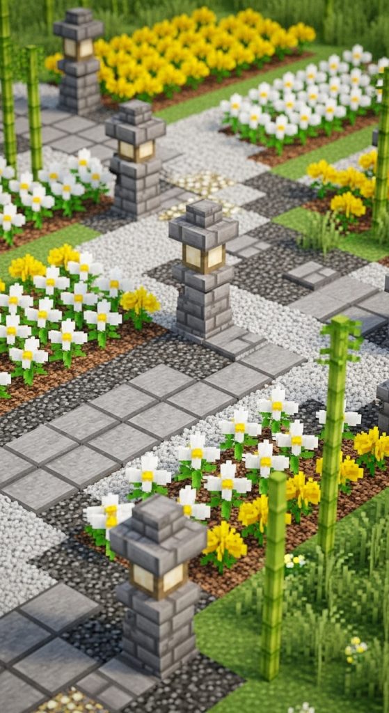 Create a calm, meditative corner in your Minecraft world with Zen-inspired flower beds. Arrange flowers in minimalistic patterns alongside gravel paths, stone lanterns, and bamboo accents. Subtle color palettes like white, yellow, and pale pink work best for achieving a peaceful vibe.