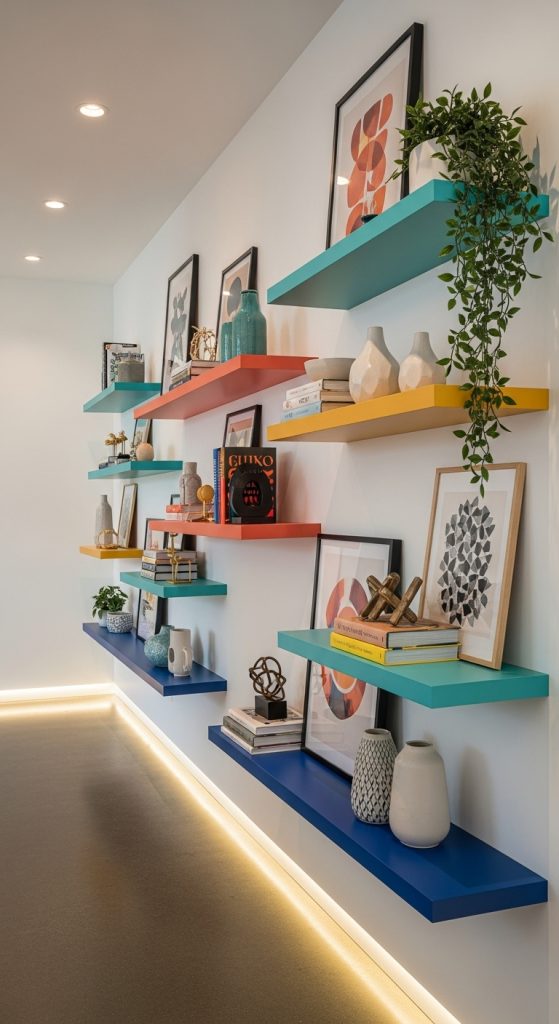 Hallways and entryways are ideal spots for artistic, colorful floating shelves. Since these areas are often narrow, floating shelves provide storage and decoration without taking up floor space.