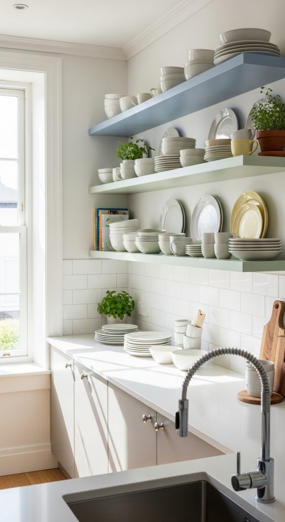Kitchens often benefit from a touch of color, and floating shelves are an excellent way to introduce it. Soft blues, sage green, warm cream, or even muted coral shelves can brighten the space while showcasing everyday items like dishes, glassware, and jars.