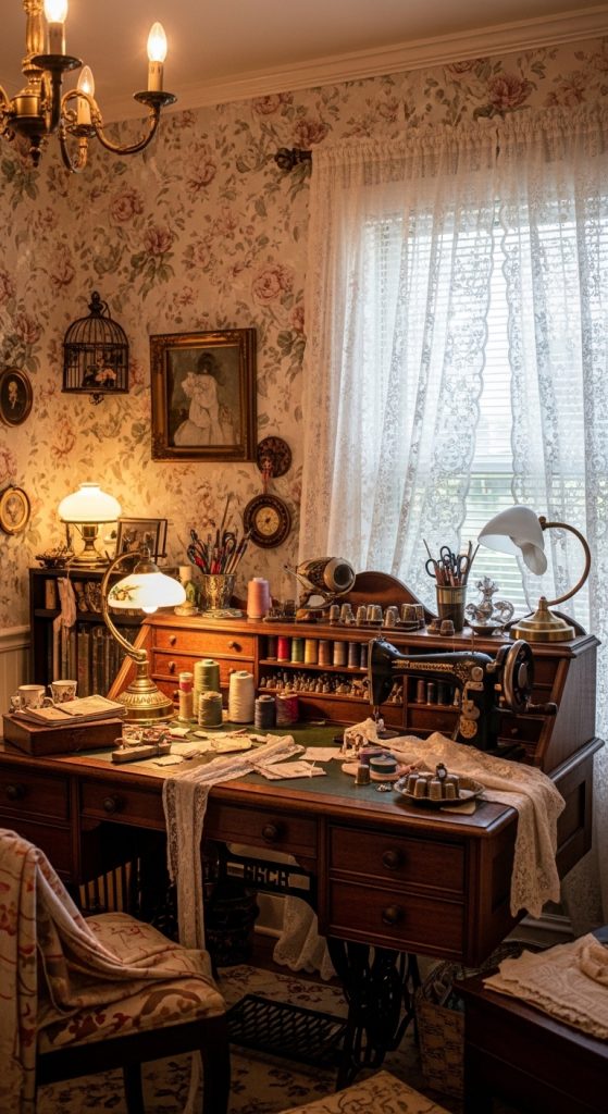 Display old sewing machines, antique frames, and decorative storage trunks. Use soft warm lighting to create a nostalgic feel. A vintage craft room feels romantic, elegant, and deeply personal.