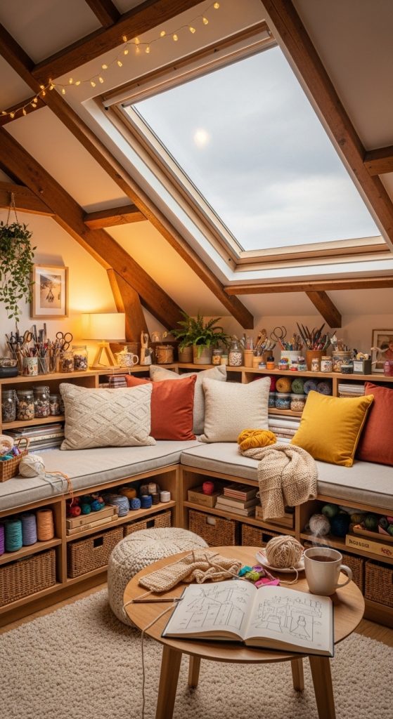 Turn an unused attic into a magical crafting sanctuary. Slanted ceilings, skylight windows, and soft lighting create an intimate atmosphere.