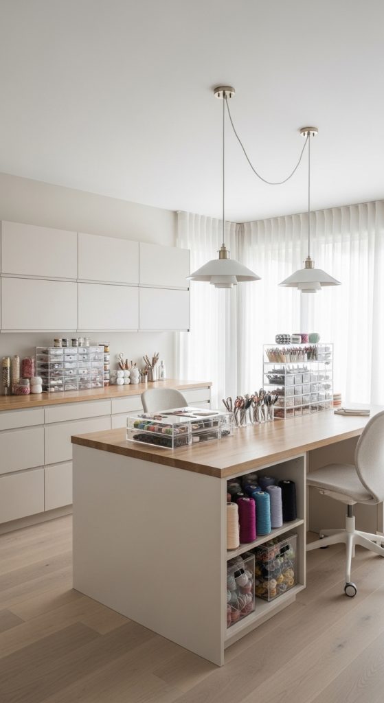 Hang a wooden pegboard on the wall to display scissors, ribbons, and tools. Add a soft neutral rug and a vintage-inspired desk lamp. The combination of wood textures and soft lighting creates a cozy atmosphere that makes you want to craft for hours.