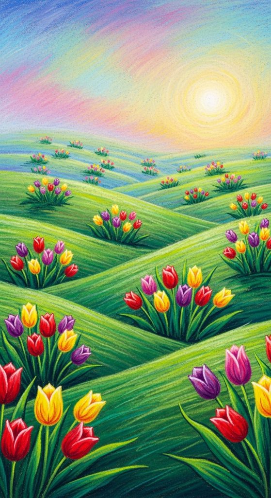 Encourage them to draw rolling green hills, bright tulips, sunshine, and soft blue skies. Show them how to gently blend colors with fingers or tissue to create smooth gradients.