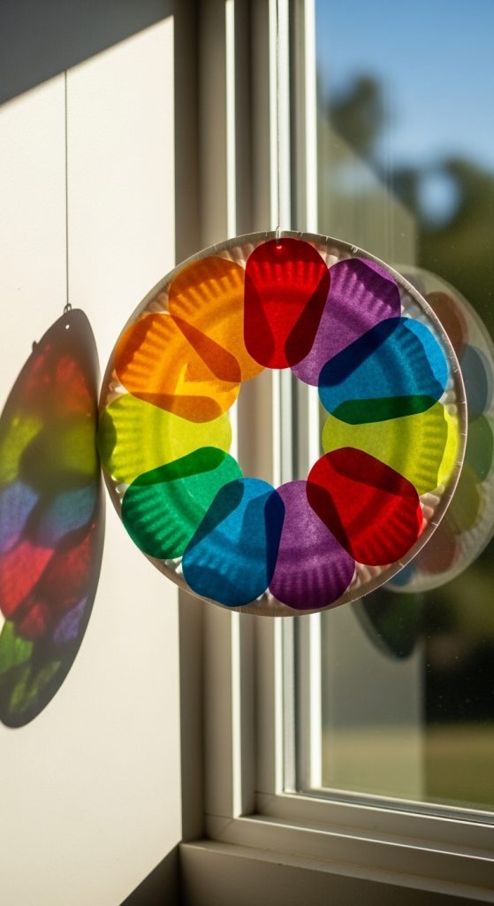 Cut the center out of a paper plate to create a frame. Fill the inside with tissue paper pieces glued onto clear contact paper. When sunlight shines through, the colors glow beautifully.