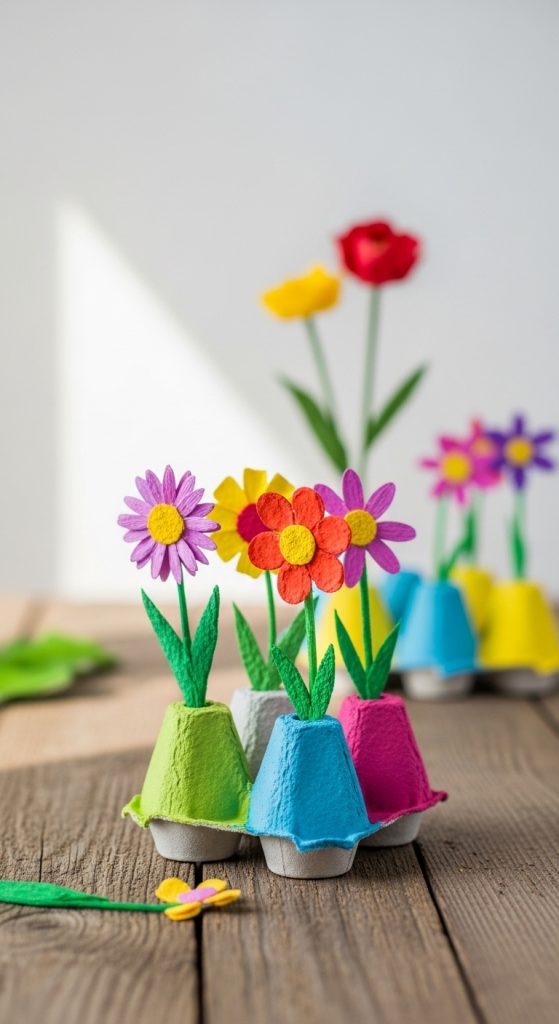 Cut egg cartons into flower shapes. Let children paint them in vibrant spring tones. Once dry, glue them onto cardboard or attach them to craft sticks to create a standing flower garden.