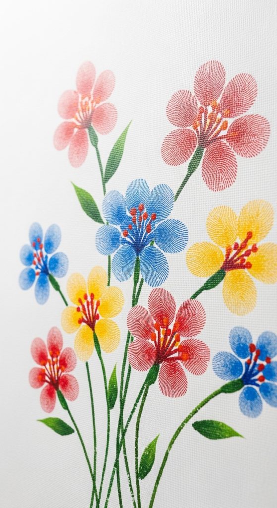 This activity is perfect for younger children who love getting their hands a little messy. Provide washable acrylic paints in soft spring shades—pink, lavender, sunshine yellow, baby blue, and mint green. Let kids press their fingertips onto canvas or thick art paper to form flower petals. Add green stems with thin brushes or markers.