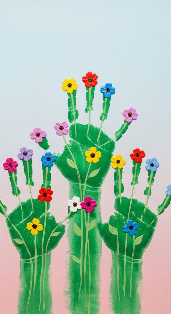 Use green paint to stamp handprints as flower stems. Then paint bright blossoms at the fingertips. Add butterflies, bees, or small ladybugs for extra charm.