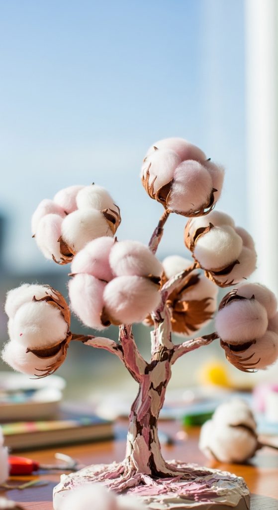 Draw or paint a bare tree trunk on blue paper. Dip cotton balls into pink and white paint, then dab them onto the branches to create soft blossom clusters.