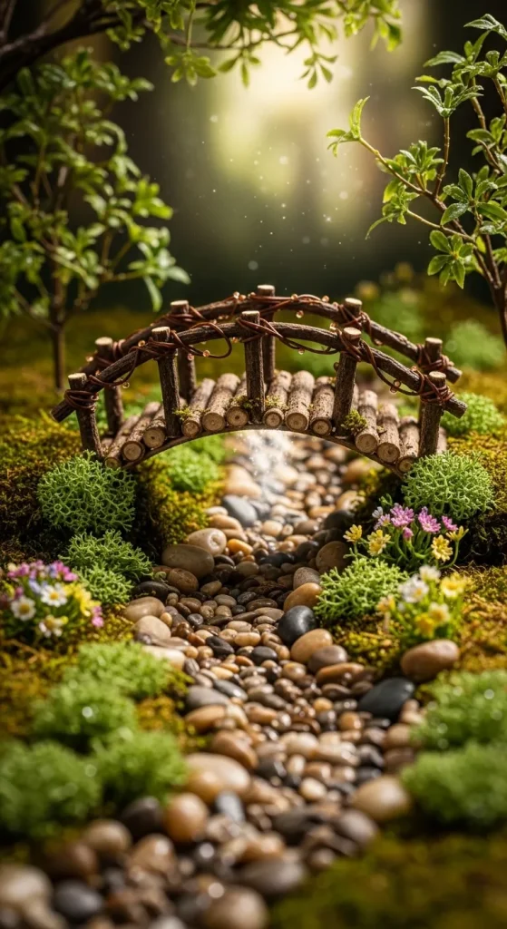 Create a miniature bridge using wooden craft sticks, small stones, and Dollar Tree hot glue. Paint it in earthy tones or metallics to give it a whimsical appearance. Place the bridge over a small patch of faux water or moss to simulate a tiny stream. This fairy garden feature adds depth and a sense of adventure, making it a favorite spot for your magical residents.