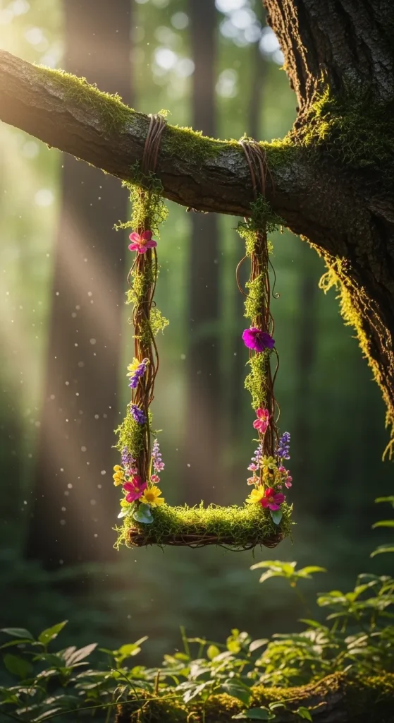 A fairy swing brings movement and life to your fairy garden. Using Dollar Tree twine or ribbons, attach a small wooden plank to a tree branch or a mini archway. Decorate the swing with faux flowers, tiny lanterns, or a small moss cushion. The swing creates an interactive element that makes your miniature garden feel magical and alive.