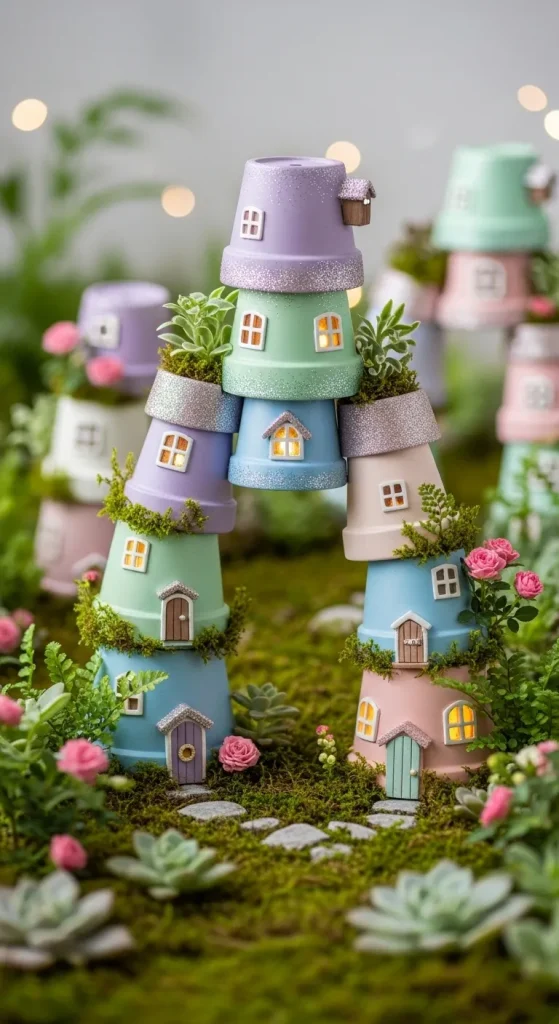 Use small flower pots from Dollar Tree as the foundation for fairy houses. Turn them upside down or keep them upright, then decorate with paint, glitter, and miniature doors or windows. You can also stack them to create multi-story fairy homes. Surround them with small pebbles or tiny artificial plants to complete the scene. This idea is perfect for adding layers of whimsy to your garden.
