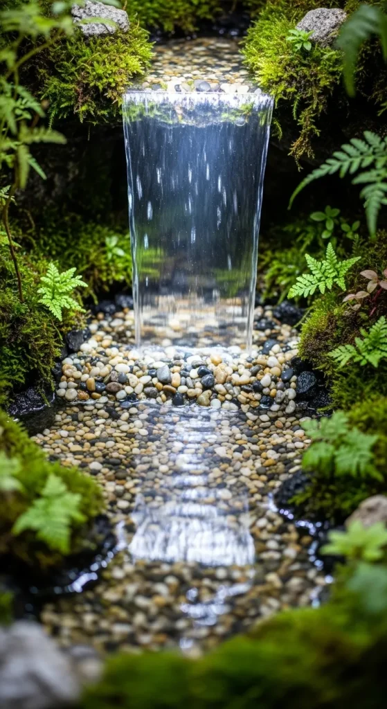 Simulate a sparkling waterfall using Dollar Tree clear acrylic sheets, glue, and small pebbles. Create a pond at the base using a small bowl or jar, then add blue-tinted water or resin for a realistic effect. Add moss, small plants, and tiny fairy figures to bring the scene to life. This water feature adds movement and serenity, making your garden a magical retreat.