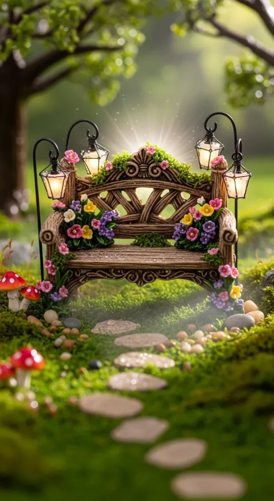 A small bench makes your fairy garden feel lived-in and inviting. Dollar Tree craft sticks or miniature furniture pieces can be painted and decorated to create a cozy bench. Surround it with faux flowers, moss, and tiny lanterns. This setup is ideal for creating scenes where fairies can “relax” in your miniature world, adding depth and charm to your garden.