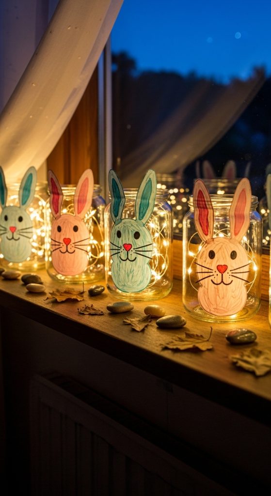 Transform mason jars into enchanting bunny lanterns. Kids can paint bunnies on the jars using chalk paint or pastel glass paints. Add battery-operated fairy lights inside to create a soft glow. Arrange several of these lanterns along a table or window sill. The effect is magical, child-friendly, and perfectly luxurious without the need for real candles.