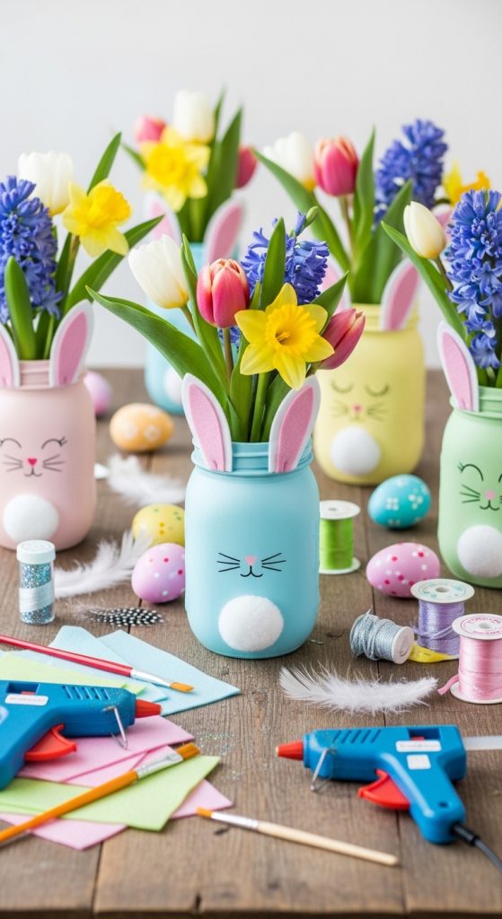 Decorate mason jars in pastel shades with bunny ears made from felt or paper. Kids can glue the ears and tails onto jars, then use them as holders for pencils, flowers, or treats. This décor doubles as a fun activity and functional storage, bringing both elegance and practicality to your Easter setup.