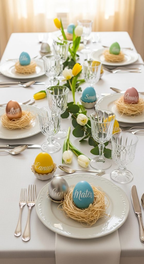 Turn Easter brunch into a memorable and elegant affair with personalized egg place settings. Hollow out eggshells and let children paint them in soft metallics or pastel shades. Write each guest’s name in delicate calligraphy, and place them in mini egg cups at each place setting. This project teaches kids patience and attention to detail while adding a refined touch to your holiday table.