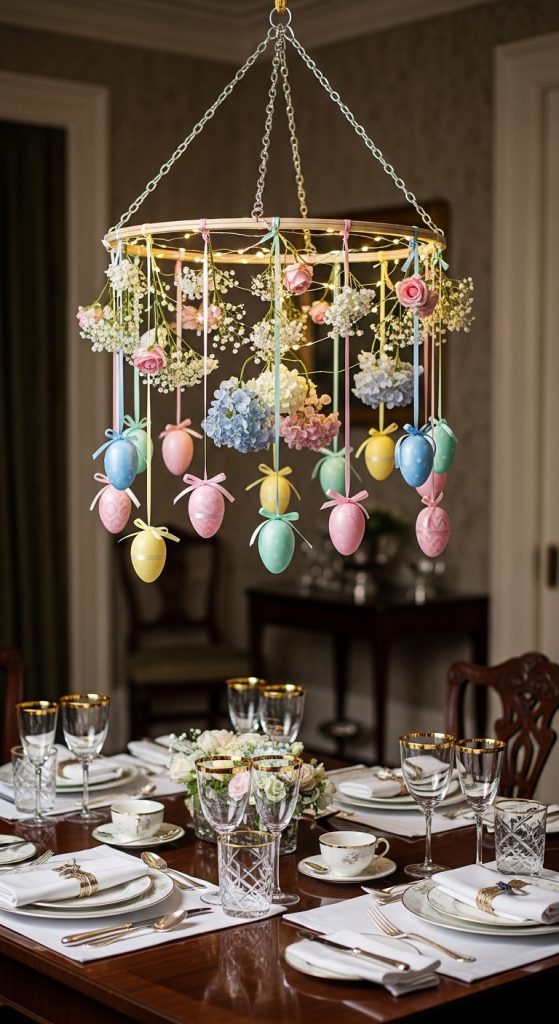 Create a stunning centerpiece with an Easter egg chandelier. Using a circular embroidery hoop or a simple metal ring, let kids hang a combination of decorative eggs using ribbons of varying lengths. Add small artificial flowers or faux pearls for a more upscale appearance. Hang it over your dining table or in a playroom for a dazzling, Instagram-worthy statement piece.