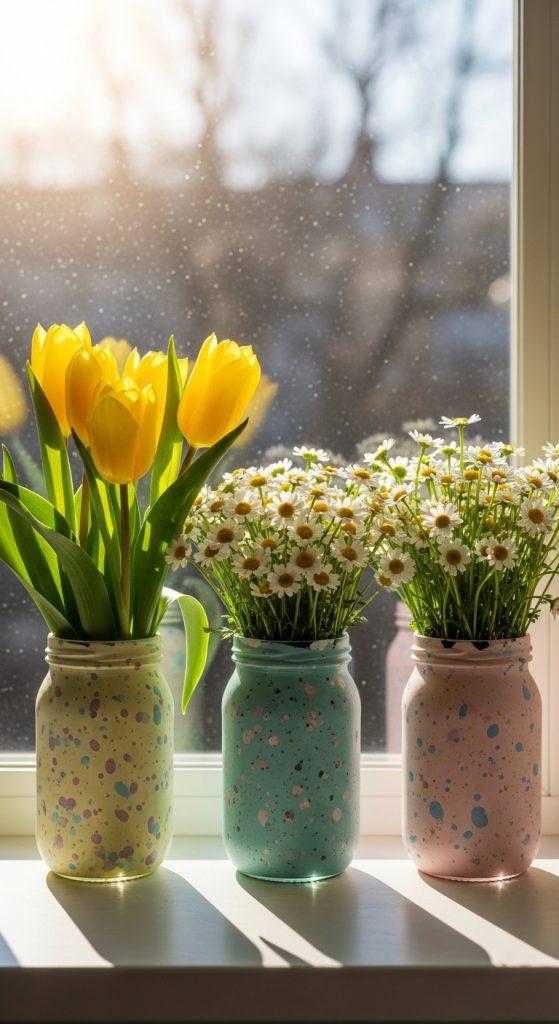 Transform ordinary glass jars into beautiful Easter egg vases. Paint the jars in soft pastel colors and add speckled patterns resembling Easter eggs. Fill them with fresh spring flowers like tulips, daisies, or lilies. These vases can be placed on your dining table, bedside table, or windowsill to instantly brighten the room.