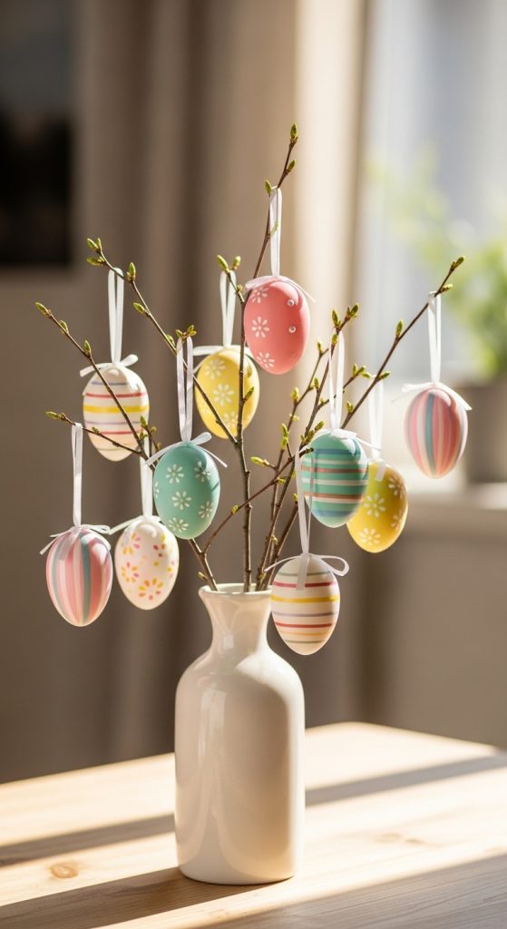 Bring a touch of nature indoors with an Easter egg tree. Use branches placed in a vase and hang lightweight, decorated eggs from them. You can paint the eggs in pastel shades, add glitter, or even tie little bows to them. This simple, elegant display is perfect for corners, side tables, or entryways.