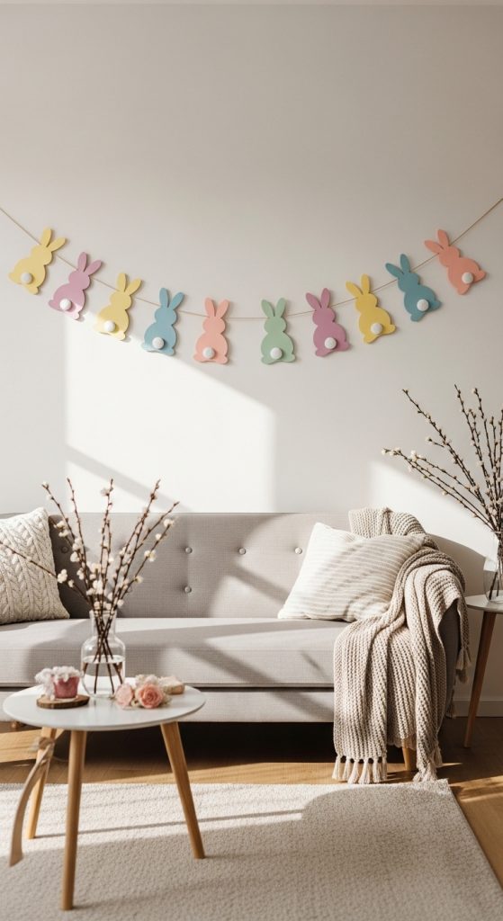 Add a touch of whimsy to your walls with an Easter Bunny Wall Garland. Using pastel-colored paper, cut out cute bunny shapes and string them together with twine. You can also add small pom-poms for tails or tiny floral accents to make the garland more festive. Hang it across windows, walls, or over a doorway for instant Easter charm.