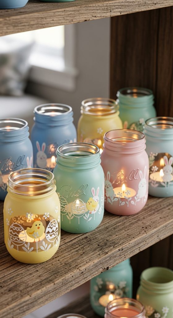 Give your room a soft, magical glow with handmade Easter candle holders. Paint mason jars in pastel colors, add floral motifs or bunny decals, and place tea lights inside. These candle holders are perfect for evening ambiance and can be used on shelves, coffee tables, or windowsills.