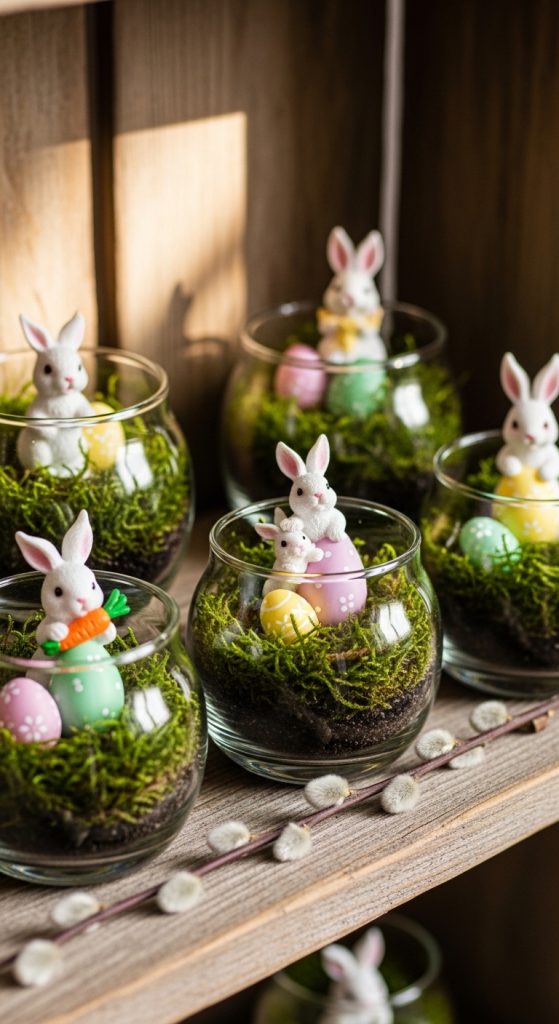 Create tiny Easter-inspired terrariums using glass jars or mini cloches. Fill them with moss, small Easter eggs, and miniature bunnies or chicks. These terrariums are perfect for tabletops, shelves, or even as a centerpiece for an Easter-themed nook.