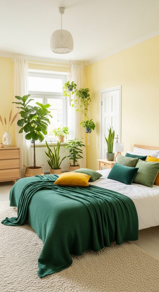 Pastel yellow walls create a soft, airy backdrop that pairs beautifully with rich emerald green accessories. Use green throw blankets, cushions, or even an emerald rug to add elegance without overwhelming the room. Wooden furniture in light tones complements this palette perfectly, creating a balanced, harmonious design. Accent the space with indoor plants for a natural, vibrant feel.