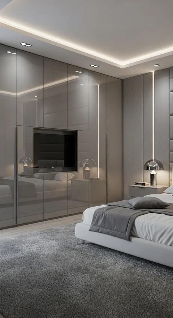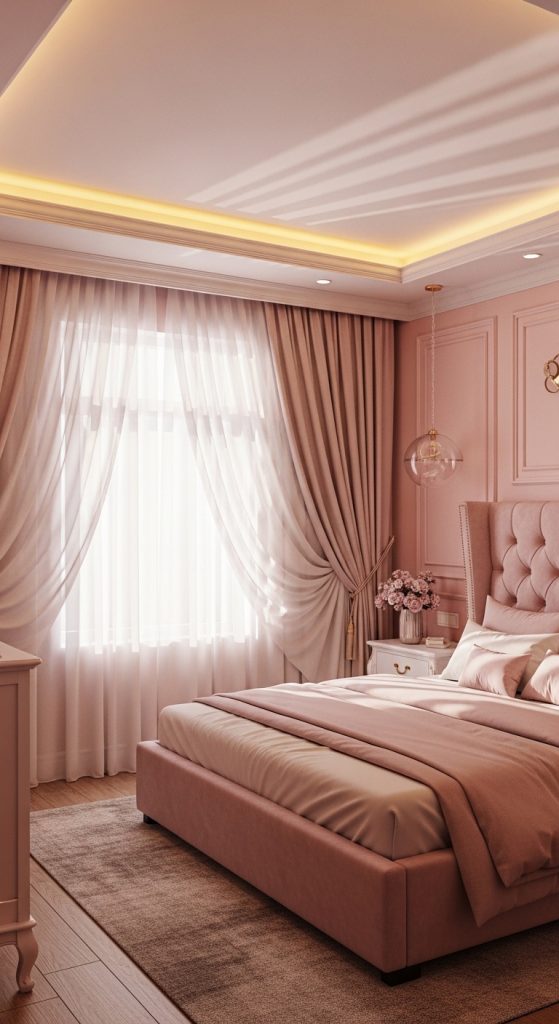 Soft lighting transforms a bedroom into a dreamy retreat. Imagine sheer curtains flowing from ceiling to floor, a plush upholstered bed, and warm golden lights glowing from hidden ceiling coves.