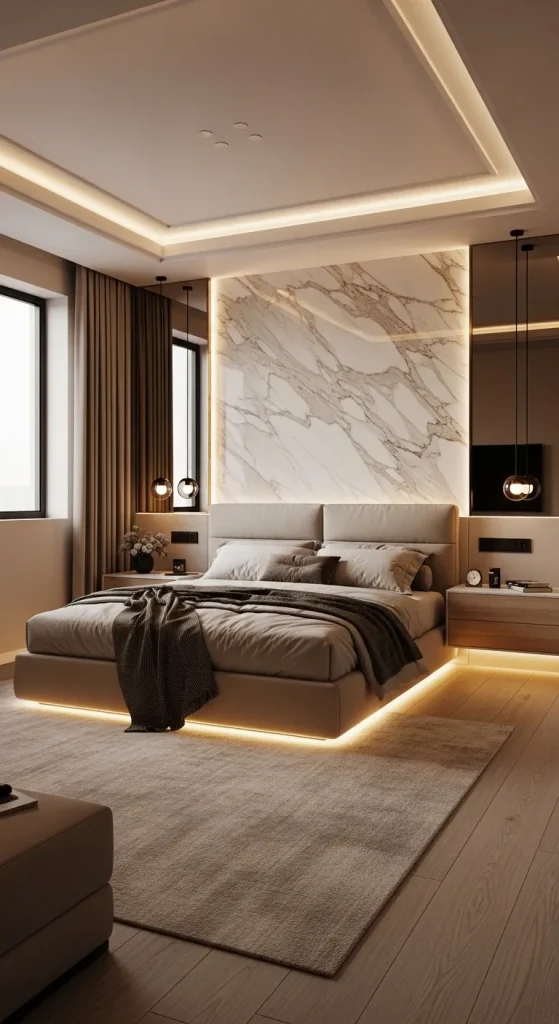 A luxury modern 3D bedroom focuses on clean lines, statement lighting, and a harmonious color palette. Imagine a king-size upholstered bed with a tall padded headboard, floating nightstands, and warm LED strip lighting hidden behind panels. Marble textures on feature walls add a touch of grandeur, while neutral shades like beige, cream, and soft gray keep everything balanced.