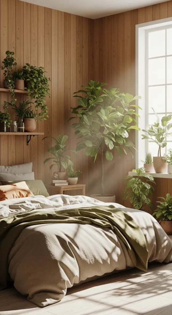 Wooden paneling, indoor plants, and linen fabrics enhance the organic feel. Large windows allow natural light to flood the space, and 3D design makes the sunlight appear beautifully realistic as it touches textured surfaces.