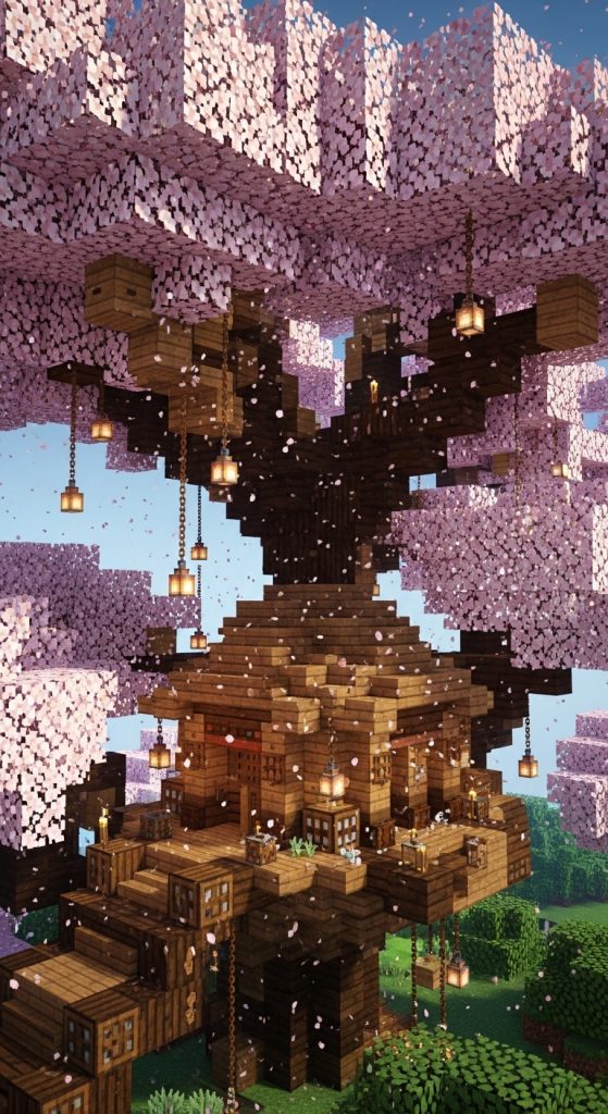 For an adventurous twist, consider building an elevated treehouse inside the branches of cherry blossom trees. Use oak wood planks and trapdoors for the structure and ladders or vines for access. Hanging lanterns from the branches create a magical, floating light effect at night.