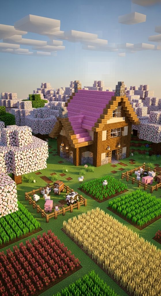 Incorporate utility and charm by building a farmhouse surrounded by cherry trees. Use oak logs, planks, and pink wool for roofing, and add a small barn or animal pens nearby. Plant crops around the house and scatter a few cherry saplings to enhance the springtime feel.