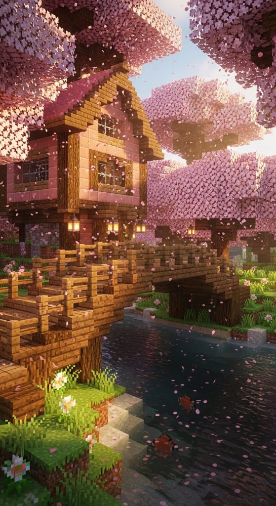 Blend functionality and beauty by building a house above a stream or river, connected with a wooden bridge surrounded by cherry trees. The house can use wood planks, cobblestone, and pink terracotta accents to match the blossom theme.