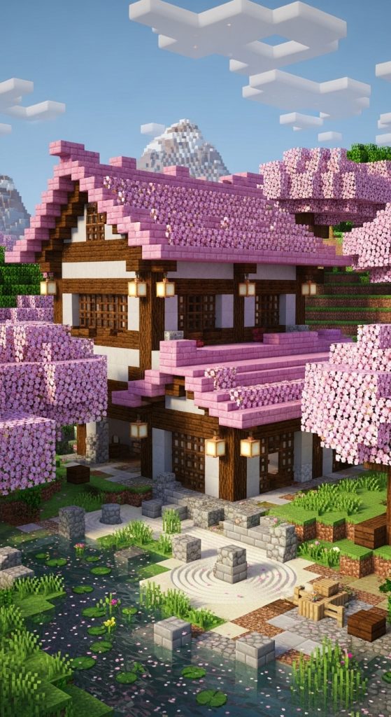 Plant a small zen garden or pond next to the house, with cherry trees scattered around. This design is both functional and aesthetically calming, perfect for survival mode players who value style and serenity.
