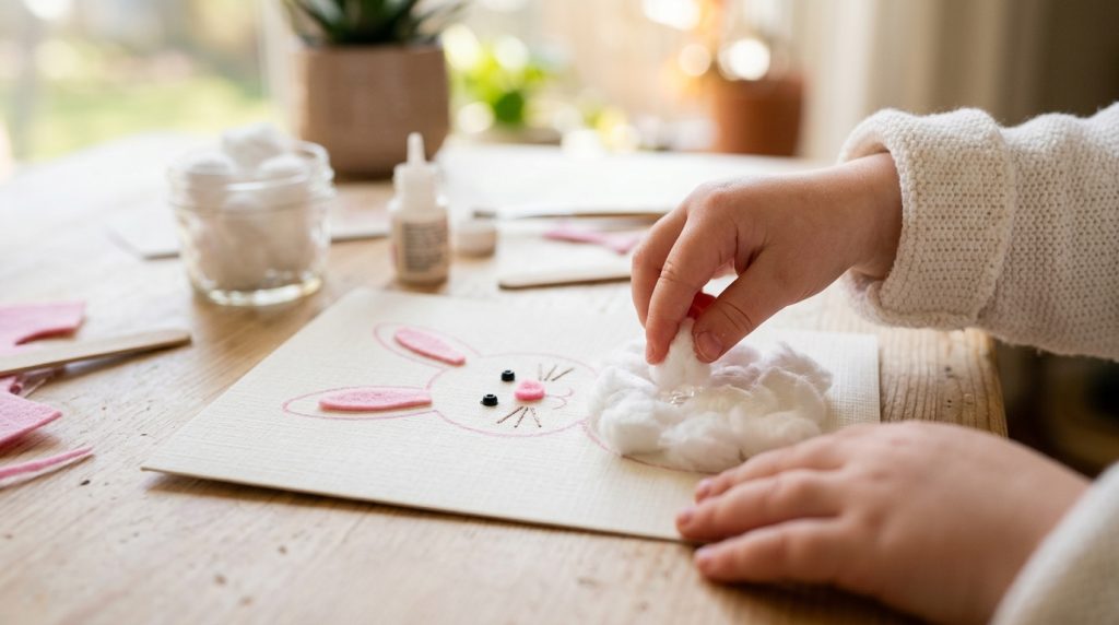 Draw a simple bunny outline on cardstock. Let kids glue cotton balls all over the body to create a 3D fluffy effect. Add paper ears, a pom-pom nose, and whiskers made from yarn or thin paper strips.